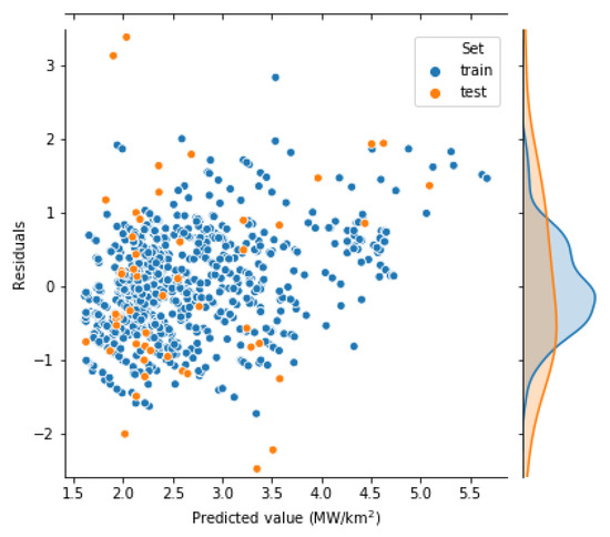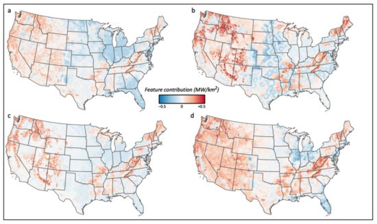 Hyperparameter settings and accuracy metrics for the best performing model are provided in Table 3. Against the independent test set, the boosted regression tree model achieved mean absolute error (MAE) of 1.02 MW/km2 and a root mean squared error (RMSE) of 1.25 MW/km2. As expected, the model performed better on the training set than on the test set, despite implementing regularization techniques (e.g., low learning rate and post-pruning). Explanatory power measured against the test set produced an r-squared (R2) of 0.40, which is a more robust characterization of how well the model generalizes.