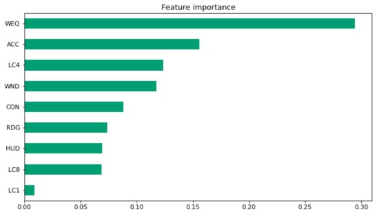 Because not all model variables contribute equally, we gauged their contributions to the model using a feature importance method established by Friedman [79]. Feature importance values indicate the relative importance of a variable within a boosted tree model and are scaled such that they sum to one when aggregated across all variables. A feature’s importance is characterized by measuring its improvements to the model averaged over all trees. Features with greater importance values tend to be more influential. Figure 5 depicts global feature importance in the model indicating that directional wind power equitability (WEQ), urban accessibility (ACC), forested land cover (LC4), and dimensionless wind energy (WND) have the greatest overall contributions, according to this measure (see Table 2 for variable descriptions). Extent of ridge landforms (RDG), housing density (HUD), and extent of planted/cultivated land (LC8) expressed moderate feature importance values, while extent of water cover (LC1) had the least importance.