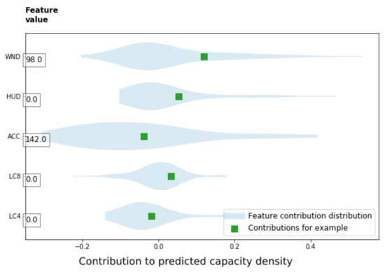 Figure 6 shows DFCs for a prediction made for a sample wind farm from the test set. Deviations from zero (i.e., the mean capacity density from the training set) indicate a feature has had a positive effect (increase) or negative effect (decrease), respectively, on the predicted value relative to this mean. For this particular example, WND and HUD had the greatest effect on capacity density, both causing an increase in the predicted value. ACC and LC4 decreased the capacity density prediction, though these contributions were minimal in this instance. DFCs for this prediction case are shown alongside the global distributions to illustrate that feature contributions vary among samples. These distributions are generated in reference to predictions made for samples from the test set. The distribution of WND contributions are centered on zero and have a long right tail indicating that capacity density predictions for some samples were greatly increased (upwards of 0.5 MW/km2) due to contributions by the WND variable. In contrast, contributions of LC4 tended to be negative, indicating that the forest cover variable largely had the effect of reducing predicted values of capacity density for test set instances. For the samples contained in the test set, the urban accessibility (ACC) variable tended to decrease capacity density predictions though these contributions were variable as indicated by the high variance evident in the global distribution.