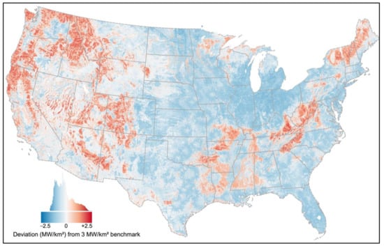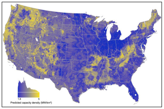 A map of predicted capacity density for CONUS is shown in Figure 7. Including all lands, we found a mean predicted national capacity density of 2.82 ± 0.75 MW/km2 with values ranging between 1.6 and 5.7 MW/km2. Findings were similar when a standard set of land-based exclusions [27] were used to exclude likely undevelopable areas, with a mean predicted capacity density of 2.76 ± 0.72 MW/km2.