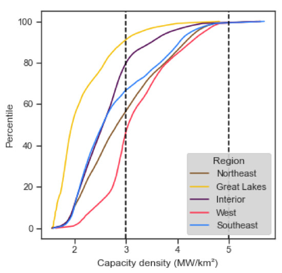 The following results are representative of the non-excluded land area of CONUS (i.e., are deemed suitable for wind deployment as described above). Investigation of the cumulative distribution of capacity densities revealed differences among wind regions (Figure 8). We found predicted capacity densities to be generally lowest in the Great Lakes region and highest in the West, with median values of 1.9 and 3.0 MW/km2, respectively. At 2.8 MW/km2, the Northeast had the second-highest capacity density as measured using the median predicted value. Interestingly, we found similar median capacity densities for the interior of the country (2.6 MW/km2) and the Southeast (2.5 MW/km2). Areas of low capacity density (<2.0 MW/km2) were present in all regions as were areas with high capacity density (>5.0 MW/km2), with the exception of the Great Lakes, where the maximum capacity density was 4.8 MW/km2.