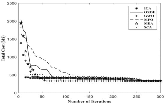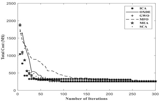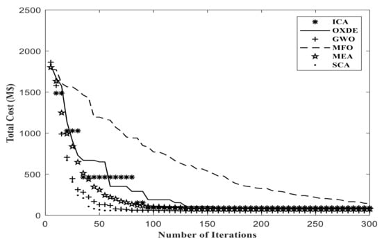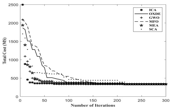 The results obtained from this scenario, applying the proposed algorithms, are presented in Table 4 and Table 5. In addition, Figure 5 and Figure 6 depict the convergence results of each algorithm to solve the first scenario.
