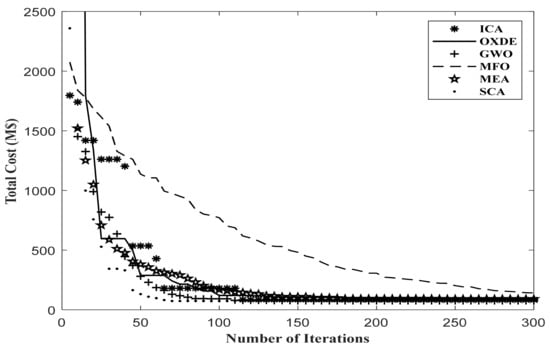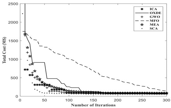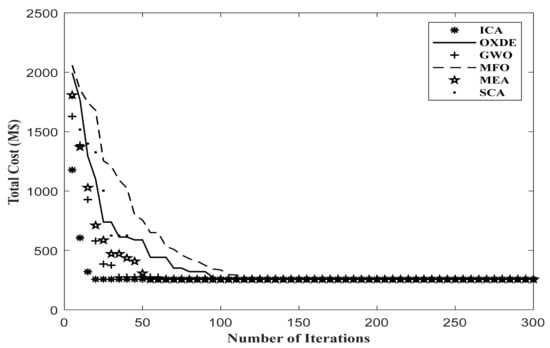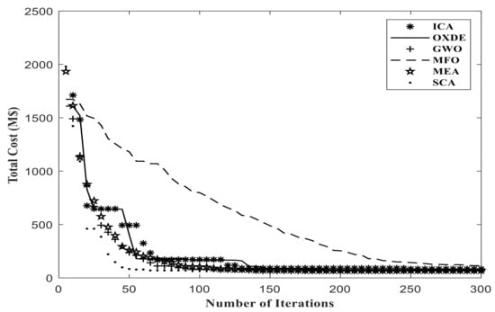 As shown in Table 2 and Table 3, the results indicate that all proposed algorithms had a good performance in solving the TEP discrete problem in small-sized networks. In comparison with the ICA algorithm in Reference [3], where the results were compared with the results of other metaheuristic algorithms, similar results were achieved. However, the GWO and SCA algorithms, and at the next stage OXDE algorithm, had better performances when applied to larger and practical networks; the reason for this was the better global search of these algorithms.