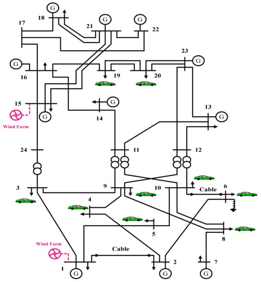 Then, the cases were implemented on the 24- and 118-bus systems to study the effects of different operating conditions in addition to the system’s base mode. The corrected IEEE-RTS 24-bus system is based on Figure 4. This system was corrected in buses 1 and 15, adding 2 wind farms with capacities of 180 MW (with characteristics of , , and m/s at average wind speed of 5.4 m/s) [6]. The corrected IEEE 118-bus system was changed for buses 36, 69, and 77, adding three wind farms with capacities of 250, 180, and 100 MW, respectively [3,57]. In these systems it was assumed that EVs in non-generation buses are connected and that the charges equaled 10% of the total system loads.