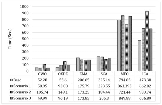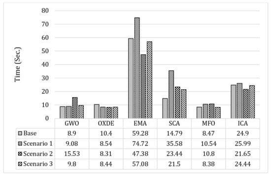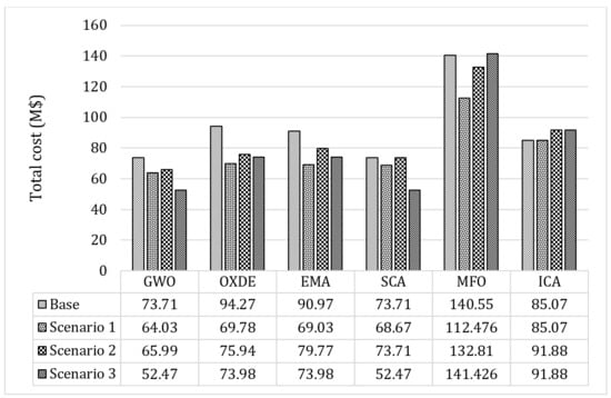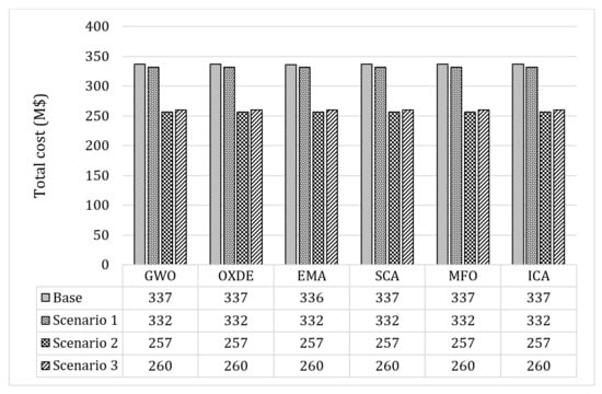 The results obtained from this scenario, applying the proposed algorithms, are presented in Table 6 and Table 7. In addition, Figure 7 and Figure 8 depict the convergence results of each algorithm to solve the second scenario.