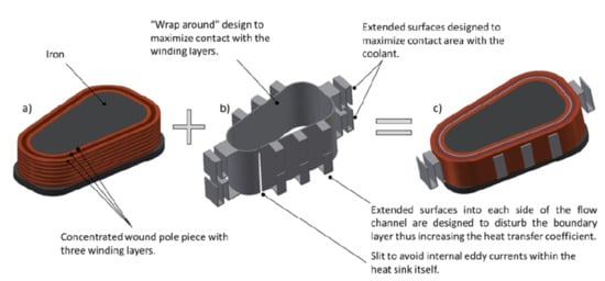 Concept for integrated heat sink: (a) Computer-aided design model showing traditional concentrated windings; (b) design of heat sink to be integrated in the windings; (c) final form the new construction.