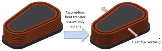 CFD modelling of electrical machine windings is complex and challenging. Difficulties mainly stem from the difference in scale between the current conductor and the insulation. The modelling of individual insulated conductors requires an inefficient fine-meshing process [] which adds complexity, computational effort, and long solution times. To simplify the problem, the windings are sometimes treated as a homogeneous material with equivalent thermal properties [,,,,,]. Yet, this approach lacks detail. The technique is also unable to analyze new designs such as the construction with an integrated heat sink proposed here. In direct liquid cooled machines, the coil is surrounded by coolant. Hence the heat generated by the individual pole pieces is transferred radially across the coils and dissipated into the coolant. Therefore, by neglecting axial heat transfer, the concentrated coil is simplified into radial layers, as shown in Figure 3. The windings used here are AWG14, hence each turn is considered as a layer. Adjacent winding layers are then interfaced to each other through a thermal contact resistance. The CFD process is described in [].
