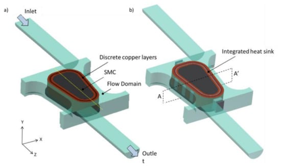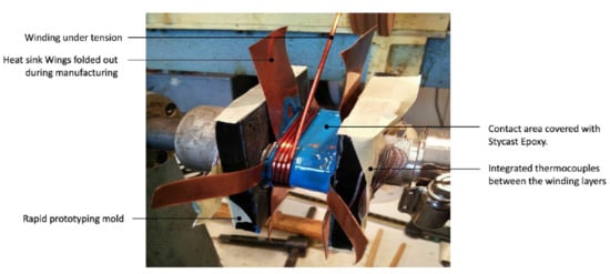 However, concentrated windings suffer from a severe temperature gradient []. Furthermore, the maximum winding temperature was shown to provide a major limitation for increasing the current and torque densities of the machines. The I2R losses in electrical machine windings generate heat. If not extracted, this raises their temperature. Since the winding insulation is rated for a maximum operating temperature and degrades by the Arrhenius chemical reaction [], high temperatures in the stator windings limits the life and rating of the machine. An increase in machine current density requires both the electromagnetic and thermal aspects of the machine to be optimized []. This paper aims to improve the current density by developing a new construction of a concentrated winding in which a heat sink is integrated into the coil. This allows for a more effective cooling of the inner coils by reducing the thermal resistance. Hence, the temperature in the windings is reduced. For the same maximum temperature, the current flow through the windings can be increased.