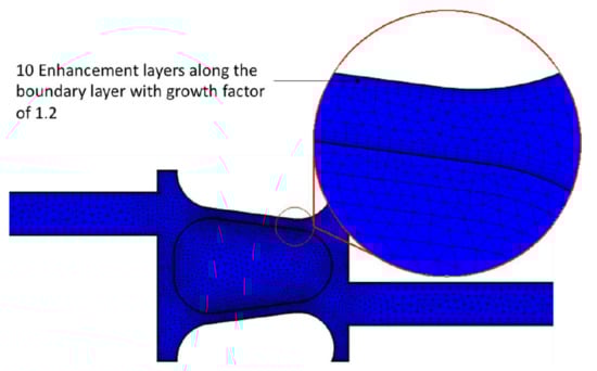 Mesh of the liquid channel in 3D CFD with details of the boundary layer.
