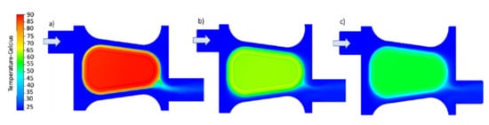 The computer-aided design (CAD) geometry of a single pole piece with representative flow domain highlighted in Figure 1 was developed. The CAD model was developed for traditional concentrated windings and a new construction, as shown in Figure 4. The simulation was run with the synthetic dielectric coolant Opticool. The properties of fluid are found to vary significantly with temperature and are described in Table 1. The pole pieces were modelled using the thermal properties of soft magnetic compound (SMC) iron thermal and copper coils as shown in Table 2. The boundary conditions were set as shown in Figure 5, having an inlet flow rate, and coolant temperature and an outlet gauge static pressure of 0 Pa to simulate the flow-out direction. This was used as reference by the Autodesk CFD Simulation software (Autodesk, San Rafael, CA, USA) to compute the pressure upstream []. Heat loads were applied to the pole piece components.