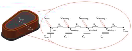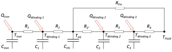 The LP model was adapted for the new construction with integrated heat sink. In this case, a new thermal node for the heat sink was introduced between the inner and middle windings. The heat sink node had thermal capacitance CHS, and was connected to the adjacent windings through the thermal resistances R2 and R2′. The heat sink node was also connected to the fluid through an additional thermal resistance RFin. Figure 9 shows a schematic of the LP model for the new construction.