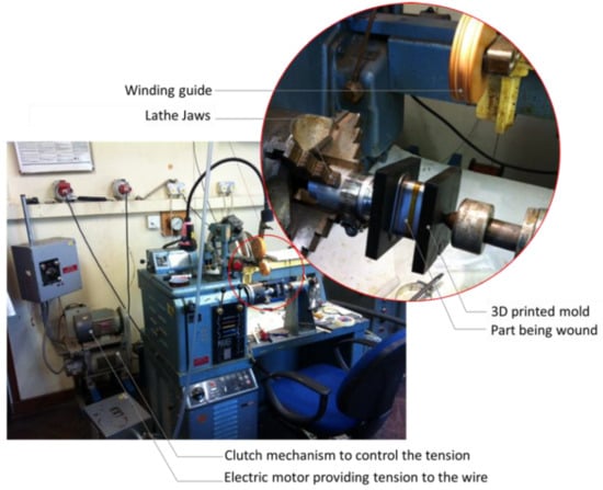 Concentrated windings are simple to manufacture. Moreover, segmented stators offer an additional benefit during the design and testing phase. as they allow for the thermal analysis of single pole pieces []. A traditional concentrated winding and a prototype of the new construction were manufactured. Each was instrumented with temperature sensors. To manufacture the prototypes, a winding machine, shown in Figure 10, was used. The machine is made of two main components: a lathe with controllable speed and modified jaws to grab the pole pieces, and a copper reel clamp coupled to a fixed speed electric motor via a clutch with controllable slip. During the winding process, the copper was subjected to tension caused by the electric motor holding the winding reel and the lathe rotating in opposite directions. The tension was adjusted by adjusting the slippage on the clutch. A mold for the bobbin was designed and 3D printed, thus allowing the jaws of the lathe to clamp the fragile bobbin without damaging it. The pole piece was wound with a square copper wire of size AWG14 (1.62 mm), at a tension of 30 N. To improve their mechanical rigidity and provide ingress protection, pole pieces are sometimes treated with epoxy encapsulation. Common techniques include vacuum pressure impregnation (VPI), epoxy painting or coating in varnish or epoxy. VPI requires a specialist vacuum chamber which sucks out the air and forces epoxy into the coil to fill the voids between the windings. On the other hand, painting and coating require no specialist equipment. Epoxy painting was adopted for this paper: a viscous layer of filler Stycast epoxy was painted on each winding layer before the next layer was wound. The properties of Stycast epoxy are shown in Table 3.