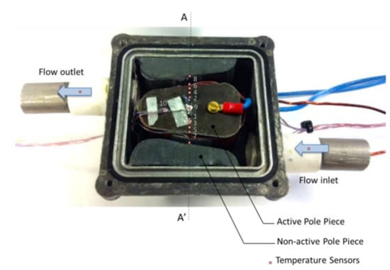 To measure the temperature profile across the instrumented pole pieces, a representative experiment was set up. Each instrumented pole piece was mounted on a plastic base and assembled in a test box. The test box was also fitted with two non-energized half poles, one on each side of the test piece, thus recreating the flow channels between the pole pieces, as shown in Figure 14. The plastic base acts as a thermal insulator and limits the heat transfer to the test box. The copper windings and the SMC iron bobbin were each connected to a DC power supply and energized separately, thus simulating the respective Joule losses. The iron losses were kept at 20% of the total pole piece losses, as per manufacturer recommendations. Current meters and differential voltage probes were used to measure the current and voltage supplied to the windings. The heat input was calculated as the product of the current and the voltage. The coolant was re-circulated from a reservoir into the test rig, and then pumped through a heat exchanger, expelling heat to ambient. The reservoir was also fitted with a heating element to control the inlet temperature of the fluid into the test section. The power input to the coolant heater and hence the coolant temperature was regulated through a transformer. The flow rate was regulated using a globe valve and measured using a variable area flow meter, as shown in Figure 15.