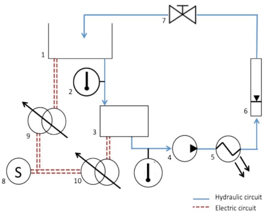 Test setup with (1) oil reservoir, (2) temperature sensors, (3) test box, (4) pump, (5) heat exchanger, (6) variable area flow meter, (7) globe valve, (8) AC power supply, (9) variable transformer powering fluid heater, (10) and the variable transformer powering pole piece heaters.