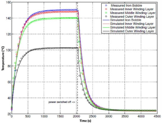 An example of a thermal characterization chart of conventional concentrated windings is shown in Figure 16. The inter-winding thermal resistances and thermal capacitances of each winding layer and SMC bobbin were identified by fitting the model to the first experimental data. The calibrated parameters of the conventional concentrated windings are shown in Table 8. The calibrated parameters of the new construction are shown in Table 9.