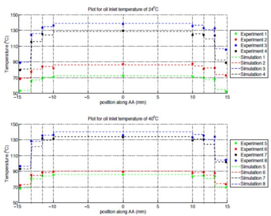 The steady state experiment established the temperature profile across the windings. The thermal models of the traditional and the new construction were compared to the experimental measurements. An example is shown in Figure 17. The plotted temperature profiles were referenced to temperature sensors mounted along the line AA’ shown in Figure 14. The calibrated models were found to match the measurements to within 3%.