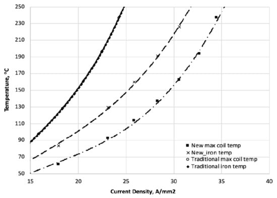 Having established the thermal characteristics of the thermal models and validated their accuracy, the LP models were used to get an accurate comparison of the temperature profile for the traditional pole piece and for the new construction for a range of coil power ratings. The heat load in the coils and the iron were increased proportionally until the hotspot temperature of the AWG 14 square magnetic wire with an insulation IEC60085 rating of 250 °C was reached. A plot of current density vs. maximum coil temperature is shown in Figure 18. The new construction was found to reduce the maximum temperature by 87 K. The new construction was found to improve the steady state current density of the coil by approximately 140% before the same hotspot temperature of the conventional construction was reached. It should be noted that this analysis is limited to matching the maximum temperature in the overall pole piece. Due to the heat sink design, the hotspot was now shifted to the iron.