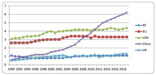 Electricity consumption in different countries from 1990 to 2019, trillion kW (authors’ scheme based on World Bank data).