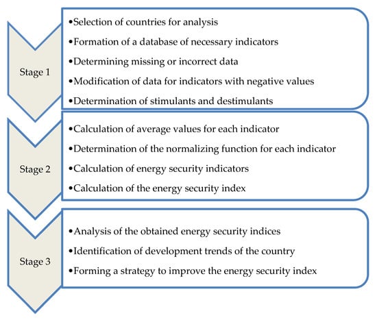 This concept is the basis for calculating the energy security index for different countries, but in this paper, only European countries are depicted. Schematically, the calculation of the economic security index was carried out in several stages (Figure 2).