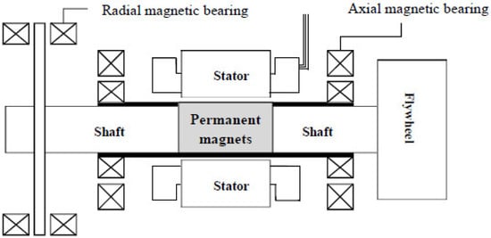 Comparing to above mentioned types, permanent magnet synchronous motors are widely used in high-speed flywheel energy storage systems [5,6]. It belongs to permanent magnet motors, just like the permanent magnet brushless DC motor. However, different waveforms of the counter electromotive force, the former counter electromotive force is a sine wave. The advantages of permanent magnet synchronous motors are: wide speed range, high power density, high efficiency, and high-power factor. However, the permanent magnet synchronous motor needs to install permanent magnets on the rotor. Therefore, the cost is relatively high. Improper use can easily cause permanent magnets to demagnetize and demagnetize. At the same time, the rotor structure is not as strong and durable as induction motors and reluctance motors. The operating speed of the motor of the flywheel energy storage system is often in the order of tens of thousands of rpm and is mostly supported by magnetic suspension bearings, which requires relatively high specific power and specific energy. The use of permanent magnet synchronous motors has higher power density and efficiency than permanent magnet brushless DC motors. Greater rotor stiffness is beneficial to increase the maximum speed of the flywheel [7].