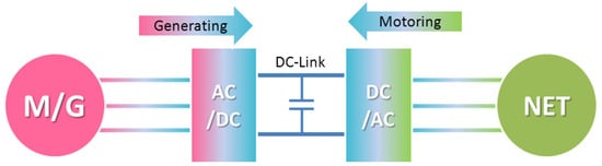 Figure 2 shows the electric driven mode and power generation mode of FESS. In the electric driven mode, the AC power source AC is converted to DC by an AC/DC converter. The flywheel is rotated through the DC/AC inverter to the target speed of 30 krpm. After that, only the minimum power to maintain the speed is continuously provided, and the shaft that reaches 30 krpm can overcome the rotation resistance to maintain this speed. In the power generation mode, it operates in the opposite way and feeds the generated electrical energy back to the grid. In an emergency, a shaft rotating at 30 krpm transmits the generated energy to the grid. In the process of energy transfer, a reaction torque will be generated on the shaft, causing the speed to decrease rapidly. During the period when the rotating shaft speed is reduced from 30 to 15 krpm within 15 s, it is necessary to be able to output 300 kW of power. When the rotating shaft speed is 15 krpm, the voltage generated will drop by 50%, so the output current will be twice the original. The reduced voltage will be increased by a voltage boost device.