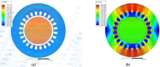 The rated power of the motor studied in this paper is 300 kw. Considering the requirements of motor weight, no-load loss and back electromotive force, the number of poles and slots and the winding method of the motor should be reasonably selected. The number of poles of high-speed motors is generally small and its combination with the slot structure design greatly affects the overall performance of the motor [17,18]. The available option is either two poles or four poles, and each has its advantages and disadvantages. The advantage of a two-pole motor is that the permanent magnets of the rotor can be integrated into a compact structure. It ensures that the rotor’s mechanical structure is isotropic in the radial direction, which is beneficial to the dynamic balance of the rotor. At the same time, it can reduce the alternating frequency of the stator winding current and the magnetic field in the iron core, which lead to reduced high-frequency additional loss. The disadvantage of a two-pole motor is that the stator winding ends are longer and the core yoke is thicker. On the contrary, the advantage of a four-pole motor is that the stator winding ends are shorter and the core yoke is thinner; while the disadvantage is that the permanent magnet rotor requires multiple permanent magnets to be spliced, which reduces the rigidity of the rotor. At the same time, the alternating frequency of the stator winding current and the magnetic field in the iron core is higher, which increases the iron loss. From the perspective of electromagnetic and mechanical considerations, especially the mechanical strength and rigidity of the rotor, it is more advantageous to adopt the two-pole solution. After the number of poles is determined, the number of corresponding slots is easier to determine. Usually a stator with a 24-slot structure is used, and the winding method is a double-layer distributed winding. The appropriate pitch is selected to improve the electromotive force and magnetomotive force waveform.