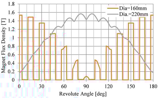 Under open circuit conditions, through equivalent circuit analysis or finite element analysis, it is necessary to modify the shape of the stator many times. In open circuit analysis, a magnetic flux path must be established so that magnetic flux saturation does not occur. The magnet material plays a vital role in the allowed magnetic flux. The rotor studied here uses samarium–cobalt (SmCo) magnets, which is a strong rare-earth permanent magnet made of samarium and cobalt alloy. SmCo magnets generally have a higher temperature rating and higher coercivity, and they are the only viable material with an operating temperature above 250 °C [20]. In particular, the maximum energy range of the Sm2Co17 products of these alloys is 20~32 MGOe, which is about 160~260 kJ/m3. These alloys have the best reversible temperature coefficient of all rare earth alloys, usually −0.03%/°C. However, they are very brittle and can easily crack and chip. Table 2 lists the typical range of properties of Sm2Co17 materials.