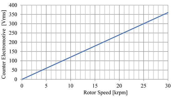 The rotating shaft with permanent magnets generates electromotive force at the stator coil terminals according to the rotation speed. The electromotive force increases with the increase in length, speed and magnetic flux density, as shown in Equation (2).