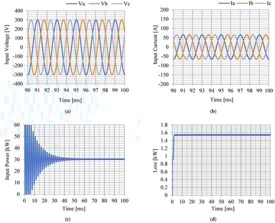 Characteristics at 30 krpm (30 kW electric driven mode): (a) Input voltage. (b) Input current. (c) Input power. (d) Loss.