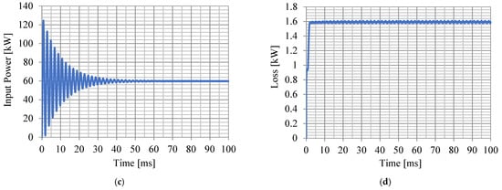 Characteristics at 30 krpm (60 kW electric driven mode): (a) Input voltage. (b) Input current. (c) Input power. (d) Loss.