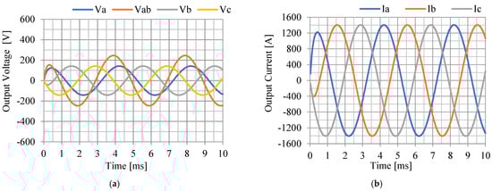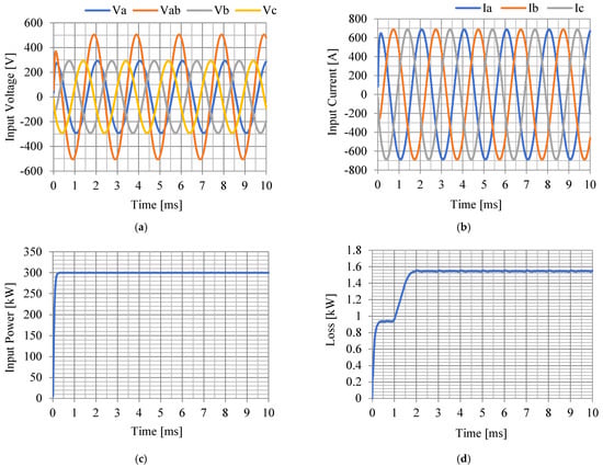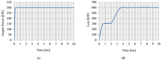 Characteristics at 15 krpm (300 kW power generation state): (a) Output voltage. (b) Output current. (c) Output power. (d) Loss.