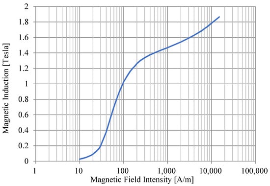 For high-speed motors, the alternating frequency of the magnetic field in the stator core is relatively high, resulting in relatively large stator iron loss, which accounts for the main part of the motor loss. Therefore, reducing iron loss is a major measure to improve motor efficiency. As the frequency increases, the ratio of stator eddy current loss to iron loss gradually increases. In summary, we should choose a silicon steel sheet with low core loss (core eddy current loss and core hysteresis loss) at high frequencies. For traditional non-oriented electrical steel, the thinnest grade is designed for high frequency applications. In this work, the motor design in this paper adopts 20PNF1500 electrical steel with low core loss under high frequency to design the high-speed motor stator. Figure 15 is the BH curve of 20PNF1500.
