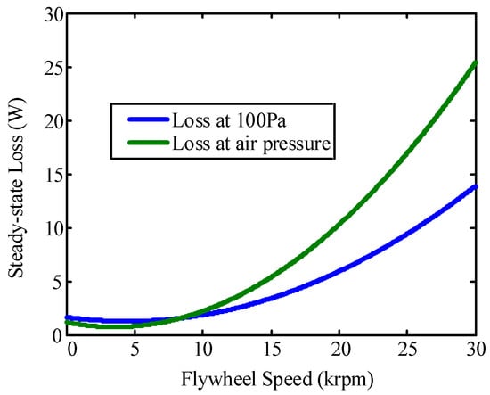 in which k is the surface roughness coefficient of the rotor (smooth rotor surface k = 1); ρ is the air density; Cf is the coefficient of air friction; ω, r and l are the angular velocity, radius and axial length of the rotor, respectively. Using Equation (6), the steady-state power consumption curve under air and rough vacuum can be calculated, which is illustrated as the green and blue line in Figure 19, respectively.