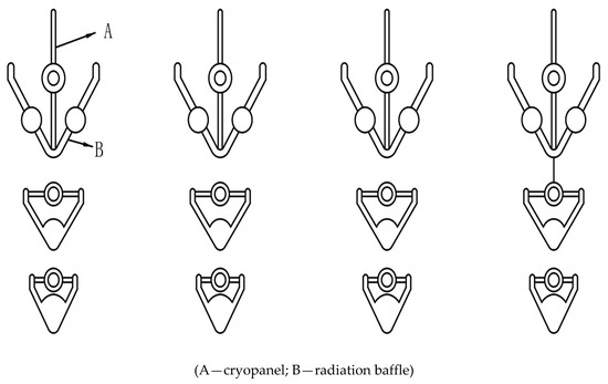Activated carbon was evenly distributed on both sides of the cryopanels and their emissivity ε was set to 0.95. The radiation baffles’ internal surface and the outer surface of first-stage radiation baffles were polished with an emissivity at 0.15 because the radiation baffles’ internal surface directly faces the cryopanels and the first-stage radiation baffles directly face the chamber’s components. In order to reduce the reflected radiation from the chamber’s components to the cryopanels, the second-stage to third-stage of radiation baffles and the outer surface of the radiation shielding walls were blackened with an emissivity at 0.95. The temperature of the cryopanels was set to 4.5 K, the temperature of radiation baffles was set to 85 K, and the temperature of the vacuum chamber was set to 300 K [3].