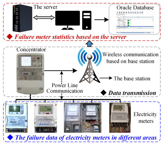 In this section, three real failure rate datasets of electrical meters from XZ, XJ, and HLJ provinces are used to illustrate the proposed method. The structure of the data acquisition system for electricity meters is shown in Figure 1. It shows that the operating state data of the electrical meters are transmitted to the concentrator through the power line. The operating state data mainly represent the electrical energy data, including current, voltage, power, and other measurement data when the meter is working. Then, the data of the concentrator is further transmitted by the base station through wireless transmission or power line. Finally, the data for number of failed meters of all locations is transferred to the server database. Moreover, if the meter fails to send the data for a certain time, its data loss state can be easily obtained and the meter may need to be replaced. As shown in Figure 1, the measuring unit mainly includes the three-phase electric energy meter and the single-phase electric energy meter. Meanwhile, the failure rate of the data includes LCD faults, out of tolerance, battery undervoltage, clock faults, and communication faults.