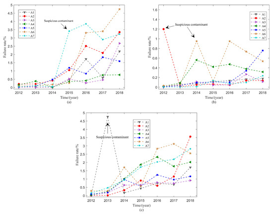 It can be seen from Figure 2 that the failure rate keeps growing during 2012–2016 and falls slightly in 2017. Obviously, the failure tendency has a strong correlation with time. The growth rates are also different from each other because the data are collected in different areas. Furthermore, several failure rate data points are particularly large in 2012–2016 of Figure 2b and 2013 in Figure 2c. Those values are completely different from other data. Therefore, it is reasonable to treat these points that are far from intensive data as suspected outliers.