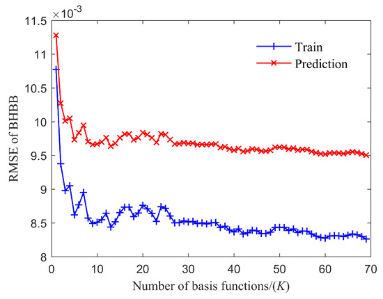 Based on the failure rate sample in Section 2, to select an appropriate parameter K, the relationship between the root mean-squared-error (RMSE) and the number of basis functions K is shown in Figure 3. It provides an example of RMSE based on the XZ. It depicts that the prediction RMSE has a huge improvement when K is less than 30. In addition, the RMSE value tends to stabilize after nearly 30 replications. It means that the results would be hard to improve with more bootstrap replicates. Hence, we set in this paper. It takes about one and a half hours to complete the training of 30 sub-models in a single line for 5000 samplings.