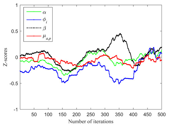 To verify the convergence of the BHBB, the z-scores proposed by Geweke are utilized to examine the MCMC chain. It compares the mean and variance at the beginning and end of the chain. The z-scores value should be located in [−2, 2], which indicates the MCMC is convergence. The z-scores results of four parameters from different layers of the BHBB are shown in Figure 5. It can be seen from Figure 5 that all the z-scores of different parameters are not exceeded ±0.5, indicating that the BHBB has great convergence.
