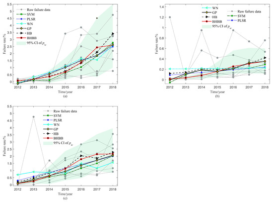 The predicted results in three areas are presented in Figure 6. It should be noted that the gray dots in each column represent the raw failure data points. For the PLSR, GP, and SVM, it shows that the results of PLSR, GP, and SVM can follow the trend of failure data, while the WN cannot. In addition, PLSR and WN cannot meet the characteristics of the failure rate data when considering environmental features. For example, the results of PLSR and WN in Figure 6b are straight lines, and they fail to capture the features of the failure rate. Additionally, the curve of SVM completely follows the data between 2013 and 2015 in Figure 6b, thus SVM is overfitting the failure data. Moreover, the prediction of SVM and GP is lower than zero in 2012 of Figure 6a,b. However, the failure rate should always be no less than zero.