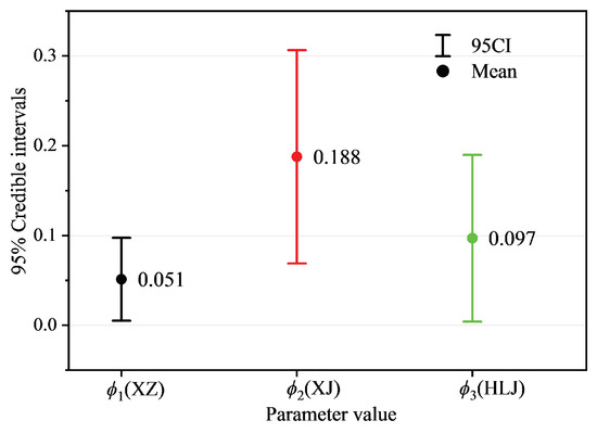 To verify the effectiveness of the outlier identification structure in BHBB, the mean and 95% CI of in Equation (4) are depicted in Figure 7. represents the proportion of outliers in the binary structure. It shows that the probability of outliers in XJ and HLJ is higher than XZ. The uncertain degree of outliers in XJ is larger due to more potential outliers leading to greater probability interval, which is consistent with the failure rate data according to Figure 6b. Broadly, the mean of the in XZ is the smallest, indicating that the number of outliers is the least. Thus, it is worth mentioning that the BHBB has the ability to identify outliers from the failure rate data.
