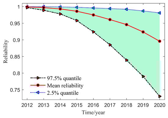 To predict the failure rate of electrical meters in the long term, the forecasting result of reliability is presented in Figure 8. This result is calculated using the reliability index in Equation (16). The quantile denotes the upper and lower bounds of the CI.