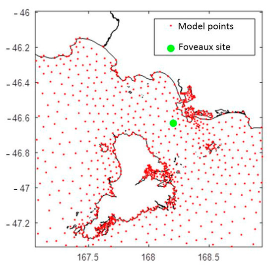 Tidal current data have been obtained from a simulation model that MetOcean Solutions Limited (MSL) conducted on an NZ-wide grid with a 0.06° resolution (5.6 × 6.6 km). The simulation nested high-resolution domains over Foveaux Strait (0.004°; 340 × 450 m) shown in Figure 3. The Princeton ocean model (POM) was used to hindcast the tidal current in a vertically integrated two-dimensional mode with boundaries provided from the global TPX07.1 solution [17].