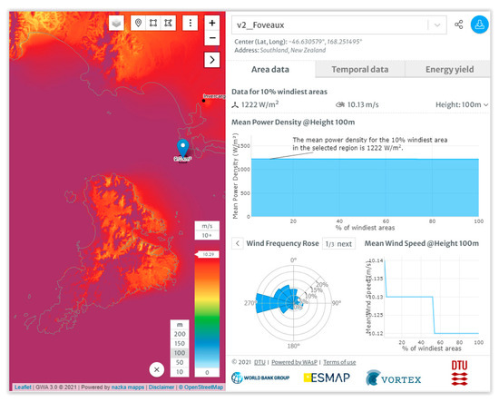 One of these points, referred to as the Foveaux site (Figure 3), has been selected for the case study, because despite being on the opposite side of Foveaux Strait, it appears to have stronger currents (better generation potential) than points close to Stewart Island’s coast, and also because the global wind atlas model [18] indicates that this point is in an area with frequent strong winds (high potential for wind energy), shown in Figure 4. For New Zealand, global wind atlas extrapolates data from a network of meteorologic recorder stations operated by New Zealand Meteorological Service (NZMS) and National Institute of Water and Atmosphere (NIWA).