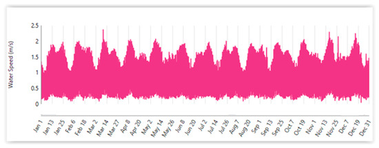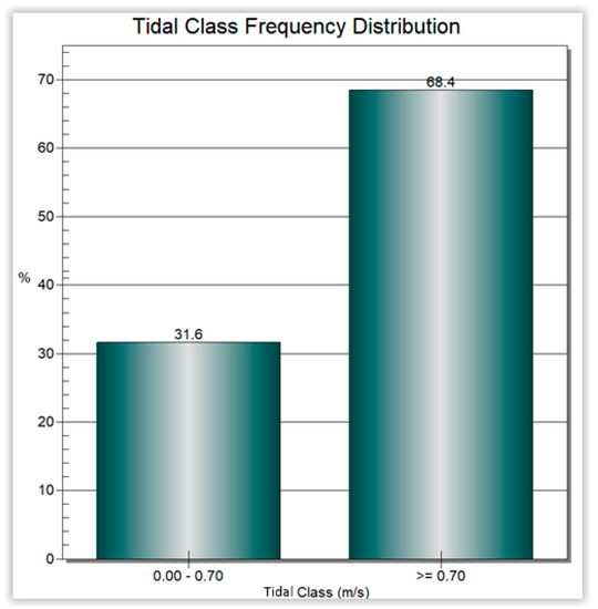 WRPLOT view software (manufacturer Lakes Environmental, city Ontario, country Canada) [21] was used to plot maximum tidal flow at 5 m above sea bottom. This was obtained by using Python (Python Software Foundation (PSF), Wilmington, NC, USA) code to create a tidal velocity profile from the MetOcean (MetOcean Solutions, Raglan, New Zealand) model’s integrated average tidal velocity. As can be seen in Figure 11, water speed for 68.4% of the year is more than cut-in speed, so the Schottel 54 kW tidal turbine is suitable for generating electricity at the Foveaux site.