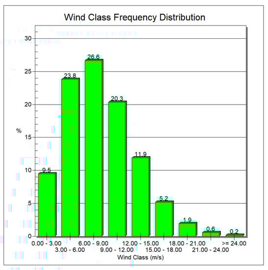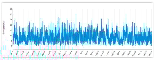 WRPLOT view software [21] was used to plot wind frequency distribution downloaded from NASA Surface Meteorology and Solar Energy database [22] at the Foveaux site. As can be seen in Figure 9, for 90.5% of the year, the wind speed is more than cut-in speed, so the XANT M-21 wind turbine will be suitable for electricity generation at the Foveaux site.