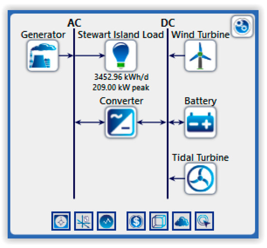 - DC electricity from the offshore Foveaux site can be integrated as a hybrid system with AC electricity from the existing onshore diesel generators at Oban by using a microgrid design, as described in Section 2. The design solution is to mount tidal and wind turbines on the same offshore platform, feed power through a DC marine cable to a DC–AC converter at the Stewart Island shore, then through an AC land cable to a system controller at Oban’s diesel generator station;