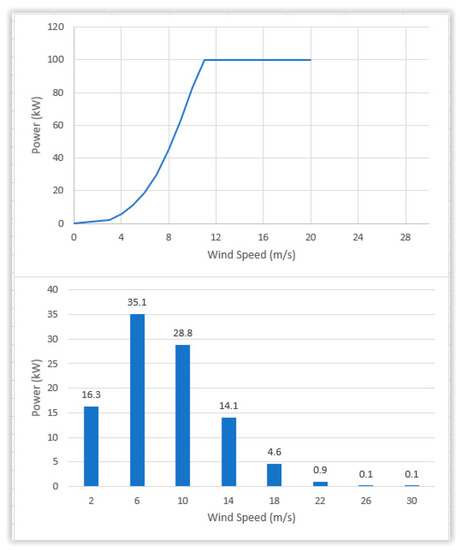 A suitable wind turbine in terms of low cut-in speed, a generating capacity capable of meeting peak load, supplying a substantial percentage of peak load and low purchase, installation and maintenance costs is the XANT M-21 (XANT, Brussels, Belgium) (100 kW). The capital, replacement, maintenance, and life of the turbine are taken as $50,000, $50,000, $2500/year, and 20 years, respectively. The power curve and percentage of generation in intervals of 4 m/s shown in Figure 8 are given by Equation (1).
