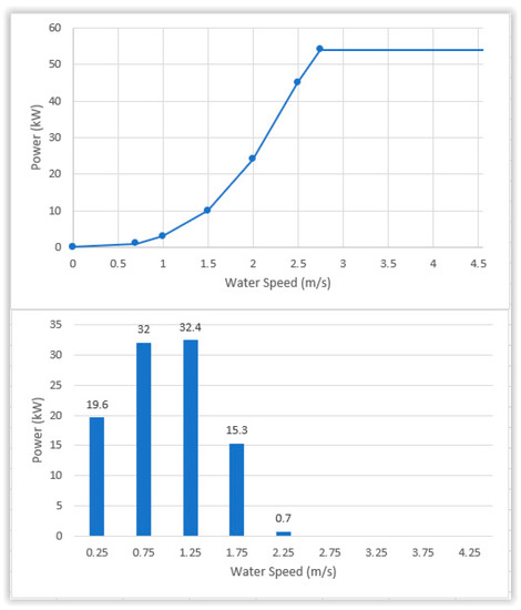 A suitable tidal turbine in terms of low cut-in speed, a generating capacity capable of meeting peak load, supplying a substantial percentage of peak load and low purchase, installation and maintenance costs is the Schottel (Schottel, Spray, Germany) (54 kW) bidirectional turbine. The capital (or installation and wiring and mounting expenses), replacement, maintenance, and life of the turbine are taken as $54,000, $54,000, $2700/year and 10 years, respectively. The power curve and percentage of generation in 0.5 m/s intervals shown in Figure 10 is given by Equation (2).