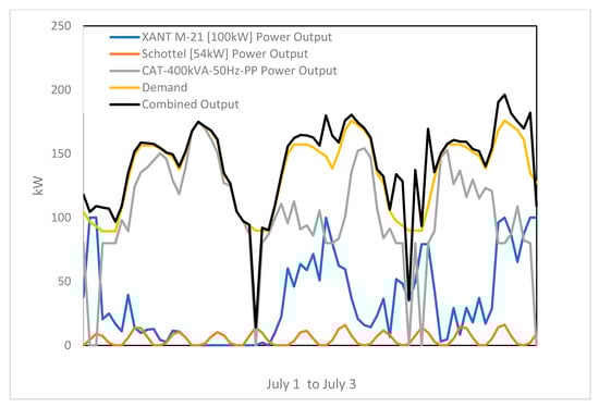 A 320 kW CAT-400 kVA-50 Hz-PP (Caterpillar, Pontefract, United Kingdom) generator is proposed to cover the base load as a low-level load at less than 25% of nominal capacity. This solution enhances the performance of generation consuming just 6.37 L/h fuel. The lifetime is taken as 90,000 h. Capital, replacement, and O&M costs are $160,000, $128,000, and $4.80/h, respectively [23] as follows: