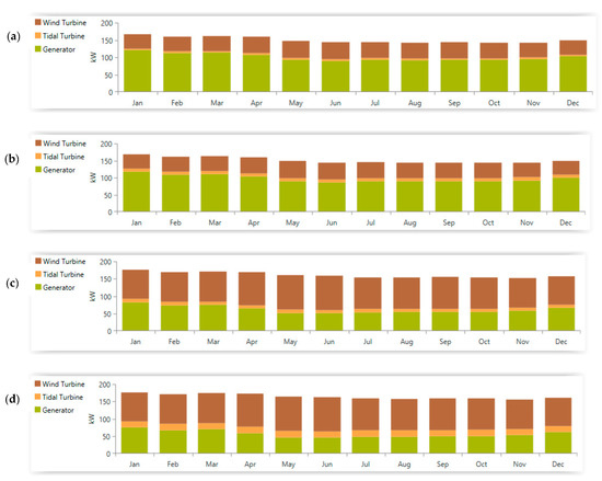 The 2W + 2T and 2W + 4T scenarios seem more economic to install and operate. To show why, Table 9 depicts the optimization results for each scenario. Their renewable fractions are 30.2%, 32.5%, 57.1% and 61.1%, respectively. A renewable fraction of 61.1% means that 61.1% of the electricity is supplied from the wind and tidal turbines, and the rest of it from the diesel generator. Hybrid systems with a renewable fraction of more than 66% are high revenue. [27]. The scenarios 2W + 2T and 2W + 4T almost meet this criterion. They have a lower operating cost, fuel cost, and NPC than 1W + 1T or 1W + 2T. Most importantly, they have a lower COE.